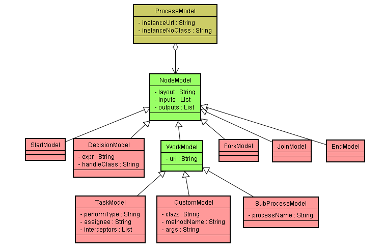 java对象ProcessModel,其中包含常用的组件模型(NodeModel子类).它们之间的关系如下图所示: