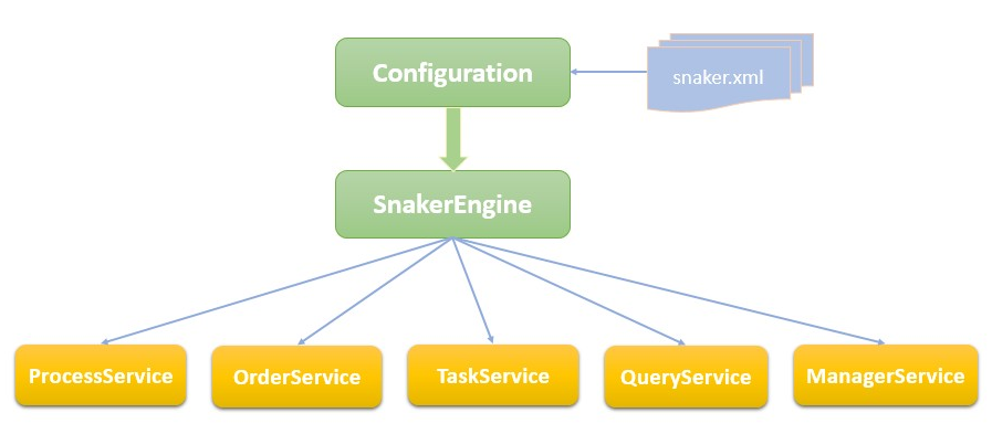 从上图可知,流程引擎SnakerEngine对象是由Configuration根据snaker.xml构建所得,并且包含四项服务: