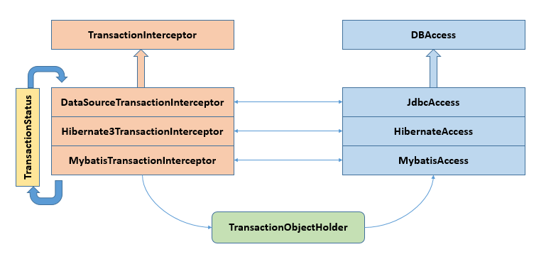 由AOP+ThreadLocal+Status来实现基本的事务管理,与DBAccess之间通过TransactionObjectHolder来传递数据访问对象(Connection/Session/SqlSession...)